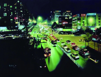 我创作的《欢迎来到我的城》系列作品希望传达一种生命力和勇敢的意志。在北京这样的大城市中,人们坚持不懈为自己的理想打拼,这是生命的力量之美,城市的繁荣进步也是人民不懈劳动的产物,所以钢筋混凝土和霓虹灯也不是冷冰冰的工业产物,它们是温暖的。我所要记录和传达的就是城市的力量和温情,从城市生活的人和场景来物化真善美的精神。时代性的精神内涵和绘画技法的发展相辅相成。在对城市生活场景的观察和描绘中,我也在逐步寻找最适合当下的绘画表达。显然我现在“浅空间”式的表达语言与一种新的写实风格距离尚远,但也是我从美院学习传统技法以来,从记录生活到主动表现生活所迈出的重要一步。