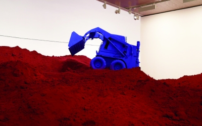 此次展览的主色调也正是红色。在中央美院美术馆的一层大厅,2013年在柏林的马丁—格罗皮乌斯博物馆展出的《致心爱太阳的交响乐》以规模较小的方式出现,血红的蜡砖不定时被传送带运到中庭中心上空,然后自由降落。在美术馆三层,卡普尔2015年在法国凡尔赛宫个展首秀的《将成为奇特单细胞的截面体》,不仅呈现了令人着迷的生物形态设计,还邀请观众通过侧面隐蔽的门进入作品内部,探索装置内部与外部之间的几何空间关系。而作品上鲜红的洞也被连接在一起,形成了一张关于躯体、存在与信仰的网。在此作品附近的另一空间,是卡普尔2017年在阿根廷纪念公园展出的工业景观《远行》,一辆涂满湛蓝颜色的挖掘机爬伏在几百吨红色泥土上,形成鲜明的对比。漫山遍野的红色色粉如浪涌一般,层层叠叠,形成热烈的景观。另一件巨型自动装置作品《我的红色家乡》则被放置在美术馆四层。机器带动一条金属臂沿着装有25吨红色软质蜡的开口容器的表面转动。金属臂在一个小时的转动中,环绕着蜡质表面缓慢运动,好像在搅拌材料,不断塑造蜡的形状,反复形成奇特景观。