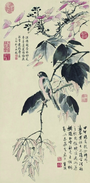 蓝瑛(1585—1664),字田叔,钱塘(今浙江杭州)人。浙派后期代表画家之一。工书善画,长于山水、花鸟、梅竹,晚年笔力更加苍劲,师画家沈周,临摹唐、宋、元诸家。清顺治十一年(1654年),70岁的蓝瑛所绘《秋色梧桐图》(故宫博物院藏)题识云:“甲午销夏龙泓,时同涛庵老社长兄清言河朔之饮旬余。晓凉过雨,遂拟赵松雪秋色老梧桐画以志,并乞教云。蓝瑛。”赵松雪即元代画家赵孟頫的别名,他曾根据李白《秋登宣城谢朓北楼》诗意,创作了一幅《秋色老梧桐图》。蓝瑛的《秋色梧桐图》乃模拟而成。蓝瑛的画没有选取挺拔参天的梧桐树,而是选取雨后梧桐枝头横斜下垂之势,集中描绘梧桐树的枝叶,突出表现秋天的特征。画中的梧桐枝叶,饱含水墨,浓淡适宜,层次分明,疏密有致,已呈现红褐色的桐叶之上挂满了桐果;一只黑头蜡嘴鸟栖息在枝上,目视前方,气定神闲,素雅可人;上面的一条枯枝横空而出,状如鹿角,劲健有力,虬曲刚劲;几枝丹枫挺俏遒劲,穿插其间,参差错落,搭配巧妙,更增添了秋天的意味。笔墨苍劲雄奇,灵动而不轻飘,作品整体显得粗中有细,豪放中又透露出江南画师独有的细腻。