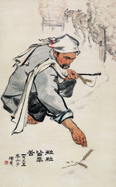 方增先初学西画,造型基础坚实,后攻意笔人物画,曾赴敦煌临摹壁画,又钻研陈洪绶、任伯年作品与传统写意花鸟画笔墨技法。所作人物形象神态生动,生活气息浓郁。后期更重笔情墨趣,画风趋于夸张、写意。