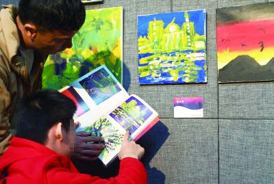 12月4日,由上海视觉艺术学院主办的“为爱添彩,通向明天——海上名家与星星专题画展”活动在上海图书馆举行。34名上海绘画名家与29名自闭症患儿的百余幅作品参展。图为自闭症患儿陈宏涛在辅导员的帮助下找到了画展上自己的作品。