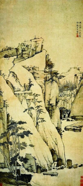 这在明末清初画僧弘仁的作品中十分明显。弘仁51岁作《松壑清泉图》,属晚期成熟画风。画面布局精巧,主体斜立一大山,山侧水口溪流涓涓,山上树石错落有致,山间置松,使人不由得想到“岁寒,然后知松柏之后凋也”。山石为弘仁一贯的少皴擦、略施淡墨晕染,干而不枯。同时以中锋细笔刻画嶙峋怪石,线条有力,转折流畅。通过大小不一的重叠排列表现出千山万壑的空间感,于清冷寒远中见得峻挺壮阔,形成弘仁所特有的“冷境”。