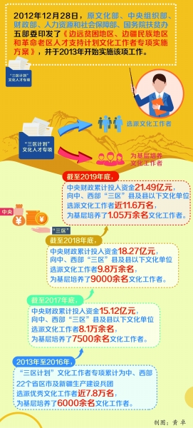 编者按:2020年是打赢脱贫攻坚战、全面建成小康社会的决胜之年。文化扶贫工作作为脱贫攻坚战略部署的重要组成部分,是推动脱贫攻坚工作的精神动力,在决胜阶段发挥着越来越重要的作用。在中共中央组织部等有关部门的指导支持下,文化和旅游部与各地文化和旅游行政部门协同配合、共同努力,“三区计划”人才支持计划文化工作者专项(简称“‘三区计划’文化工作者专项”)以文化人、以文育人的社会效益和文化扶贫的切实成效逐步显现。近日,本报组织记者赴多地采访,各地文化和旅游厅局人事处负责人和当地群众针对该项目实施过程中遇到的普遍性难题,提出了应对建议,分享了经验,展现了项目为各地群众带来的极大获得感。