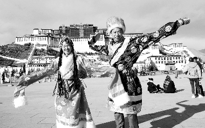 图为两名内地游客在布达拉宫广场前,穿着藏装留影。